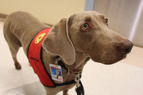 Behan would return to the PAWS program with Emma, another Weimeraner she had adopted. For the past nine years, the team has visited clinics across the hospital. Emma is the first therapy dog to assist with physiotherapy. During sessions, she works alongside the health-care provider and acts as a reward, non-pharmacological pain relief and a motivational source for patients. For example, she will crawl through a play tunnel so that the patient will follow along. She has encouraged patients to take their first steps after surgery, because they like holding her leash and walking with her. Emma also has a collar decorated with bits of Velcro, laces and buttons for the patient to fasten and unfasten.