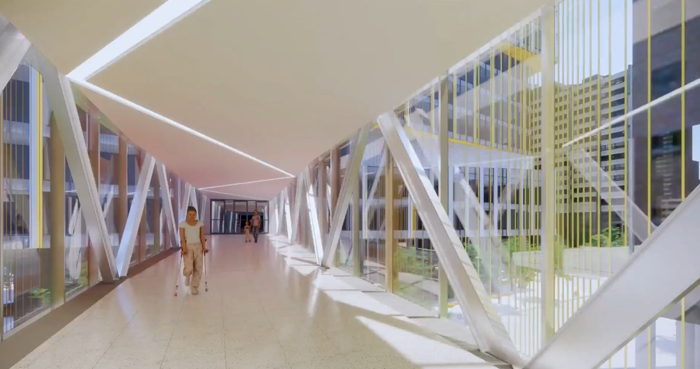 In addition to reaching the highest point of construction on the PSC, we reached another project milestone by erecting the new pedestrian bridge that will connect SickKids Atrium to the PSC when it opens next year. The original bridge was dismantled in 2019 to prepare for demolition of the Elizabeth McMaster building. Now, a newer and wider bridge connection has taken its place. The new bridge will be open to SickKids staff, patients and families in 2023, when the building opens.